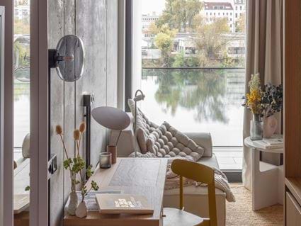 Bo centralt. Denne unikke suite på 32 m2 har et separat soveværelse og opholdsrum med fantastisk udsigt over Spree-floden.