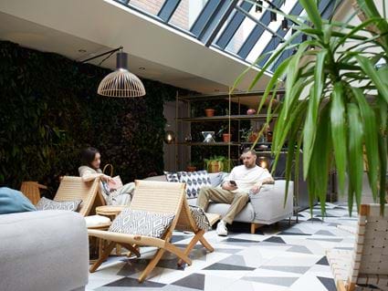 Full of greenery and comfy furniture, this light, bright space invites you for morning coffees, lunchtime break-outs, and even sunset beers.