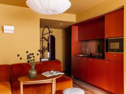 Dotée d'une superficie de 67 m², notre suite Roseraie sophistiquée offre un espace exceptionnel. Un magnifique plafond en verre entouré de plantes suspendues illumine le coin salon central, surplombant la cour d'entrée historique. Avec une table à manger de 8 places, un îlot de cuisine et un très grand canapé pour recevoir vos invités.